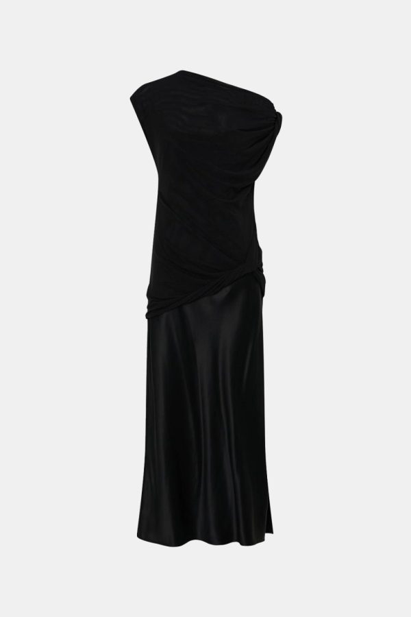 The Ando Midi Dress is an elevated blend of fluid satin and delicate silk tulle, designed for an effortless yet refined look. A beautifully draped twist detail cascades over the left arm and hip, enhancing the asymmetry of the silhouette with precision. Cut on the bias for a flawless fit, the scoop neckline and ankle-grazing midi length create a timeless balance of femininity and modern allure.