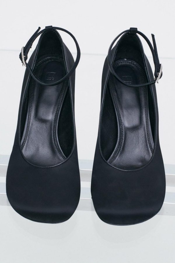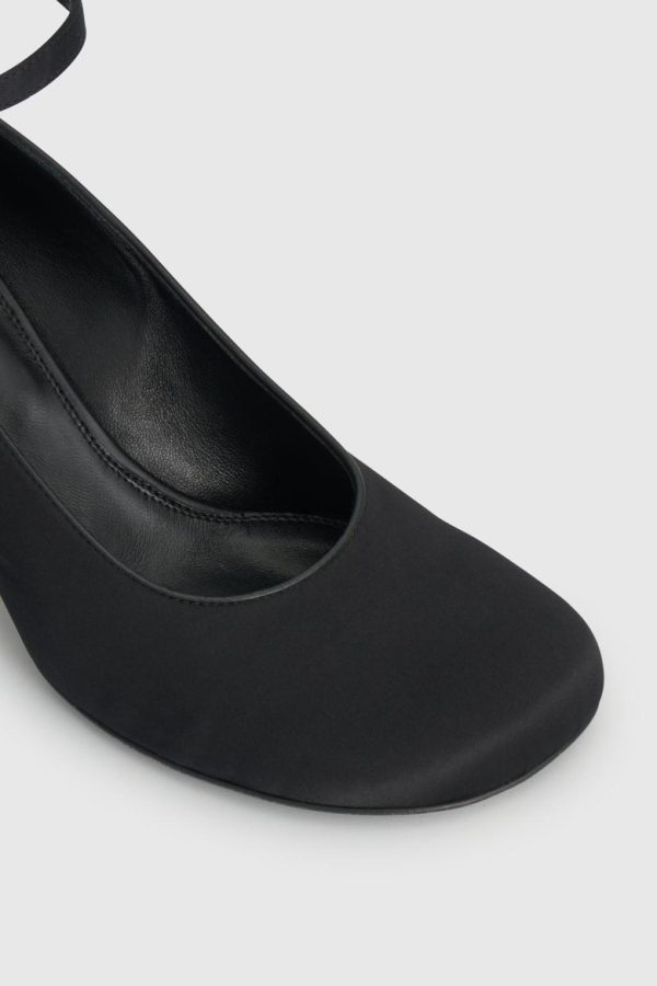 The Aurora Ankle Strap Pump is crafted from a leather blend in a rounded pump silhouette. This piece features Italian satin with a delicate, removable ankle strap and a sleek adjustable buckle.
