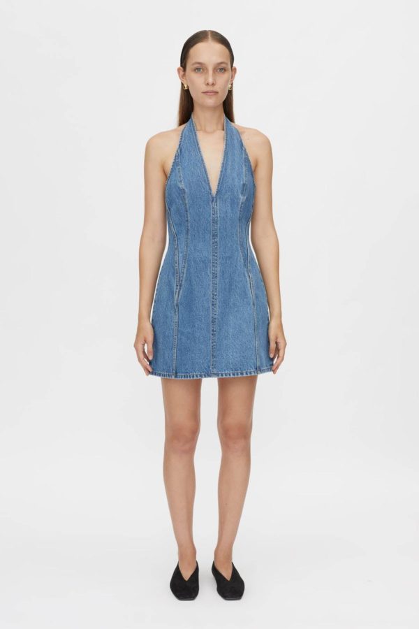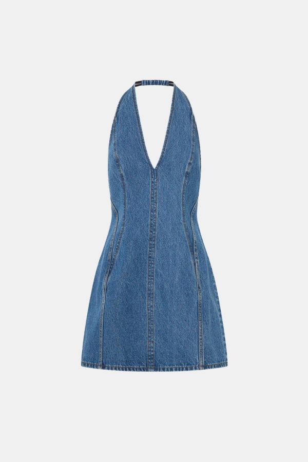 The Cascadia Denim Mini Dress is crafted from a cotton-blend fabric in a fitted, halter-style mini dress silhouette. This dress features a V-neck and centre back zip closure.