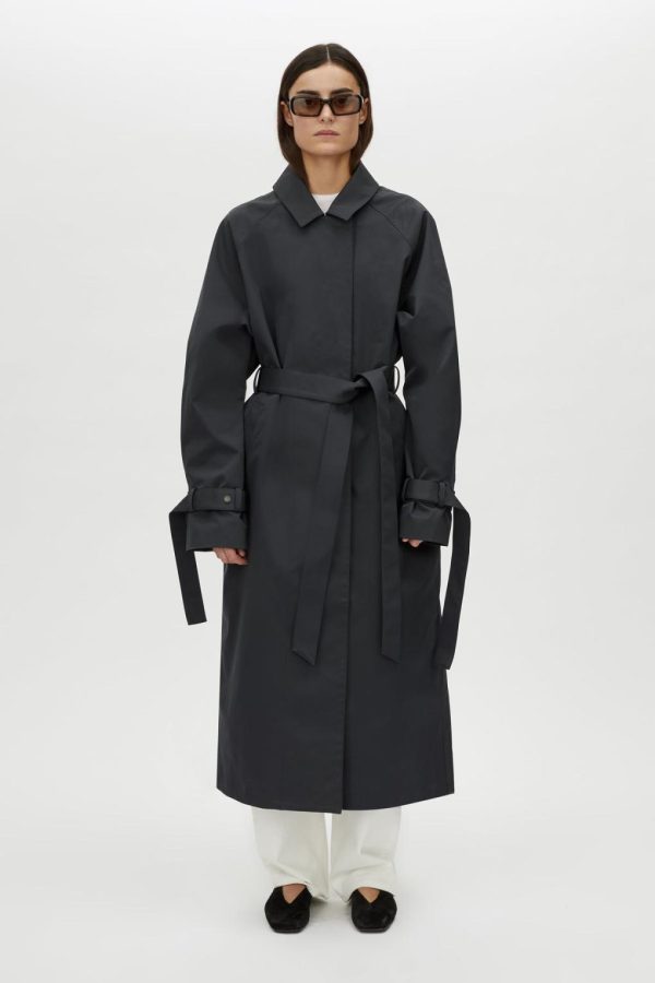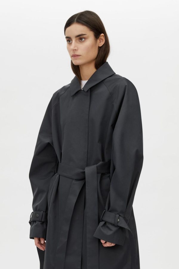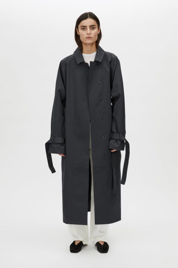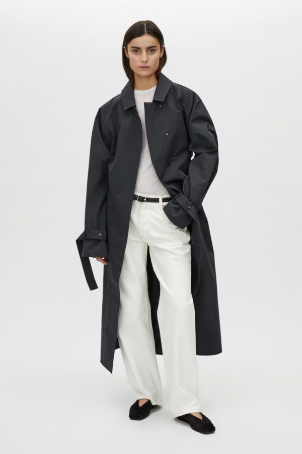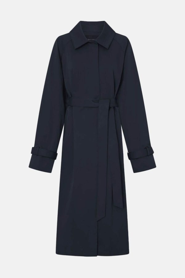 The Dia Car Coat offers a timeless, versatile design with a sleek single-breasted silhouette and concealed placket for a refined look. Raglan sleeves and a dropped armhole create an effortlessly modern fit, while adjustable oversized sleeves and a self-fabric tie belt add functional style. Finished with a back storm flap, twin needle top stitching, and a centre back vent, this fully lined coat combines precision craftsmanship with practicality for any season.