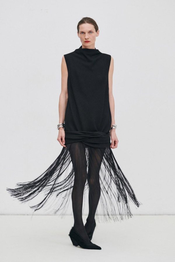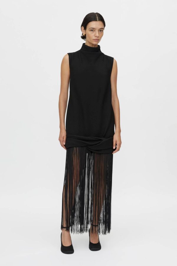 The Starling Dress is crafted from a softly structured fabric in a high-neck, midi silhouette. This dress features long fringing from the hem and centre back seam with an invisible zip.